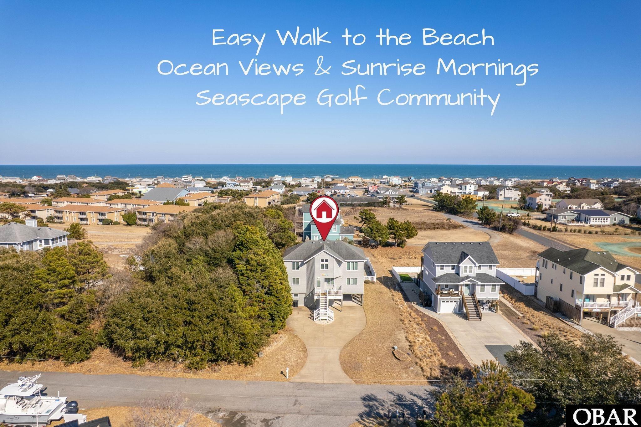 OCEANVIEWS! Perfectly positioned in the sought-after Sea Scape Golf Course community in the northern part of Kitty Hawk, this beautifully maintained 2,200 sq ft home offers the perfect blend of coastal living and a quiet neighborhood setting—just an easy walk to the beach and the golf-course clubhouse and restaurant. Several popular local restaurants are also nearby and easily accessible by foot or bike.