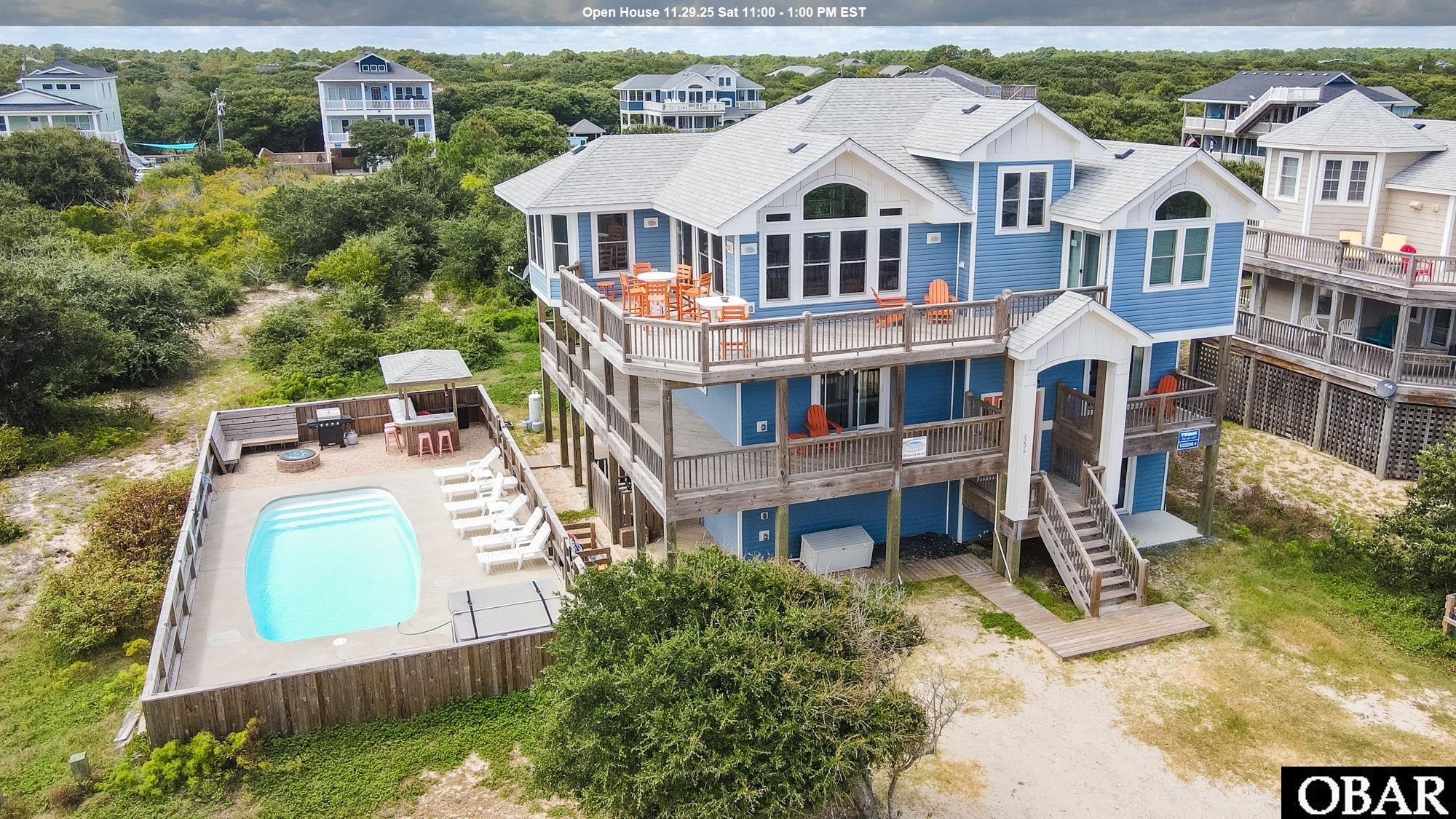 Discover your ultimate coastal escape in the secluded 4x4 beaches of Carova, a magical location where the wild horses still run free and the Atlantic is just steps from your door. This exceptional, semi-oceanfront home boasts an impressive 3,500 square feet, offering unparalleled space and luxury with 8 bedrooms and 6.5 baths, all safely situated in the desired X flood zone. Built for entertainment and relaxation, the property features a ground-level haven complete with a large game room featuring a pool table and wet bar, a dedicated laundry area, a spectacular movie theater room with stadium seating for sixteen, and three comfortable bedrooms with two full baths. Outside, a private fiberglass pool and hot tub await, complemented by the rare addition of a concrete driveway and basketball hoop. The mid-level hosts four spacious bedrooms, three with deck access, while the top floor reveals a stunning vaulted-ceiling great room bathed in natural light, centered around a cozy stone-surround gas fireplace. The chef’s kitchen is a culinary dream, equipped with an eat-in island, Corian countertops, a wine fridge, and an Italian-made Verona range oven, all opening onto a deck with refreshing ocean views. Uniquely, the top level also offers access to a small, charming reading loft perfect for quiet moments. The top-level is completed by a luxurious primary suite featuring a private balcony and a dual-vanity bathroom with a soaking tub and separate tile shower. This popular vacation rental has been meticulously maintained, benefiting from extensive recent improvements over the last three years, including new AC-5 rated flooring on all levels, updated HVAC systems (3 exterior units, 2 interior handlers), a new hot tub, new top-level decks/railings, and new appliances. Additional updates include a new water treatment system and all new living room furniture and outdoor furnishings, making this home truly turn-key. Attractively priced for its size and premium location so close to the ocean, this property represents a fantastic investment or a grand personal retreat.